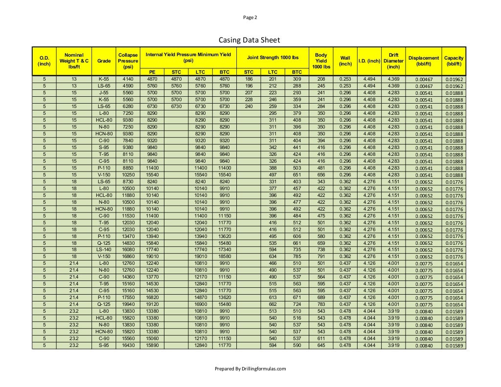 Oilfield Casing Data Sheet Free Download