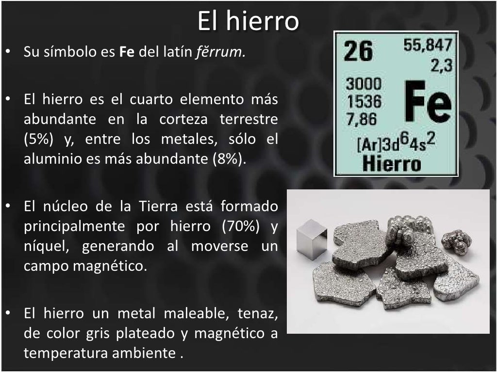 Luego, se libera al espacio. En resumen, el hierro se forma a partir de supernovas y se encuentra en la tierra en forma de minerales de óxido de hierro. El hierro fundido escurre hacia abajo, acumulándose en la base del alto horno. El hierro, es un elemento químico, un metal de transición, con número atómico de 26, que forma parte.