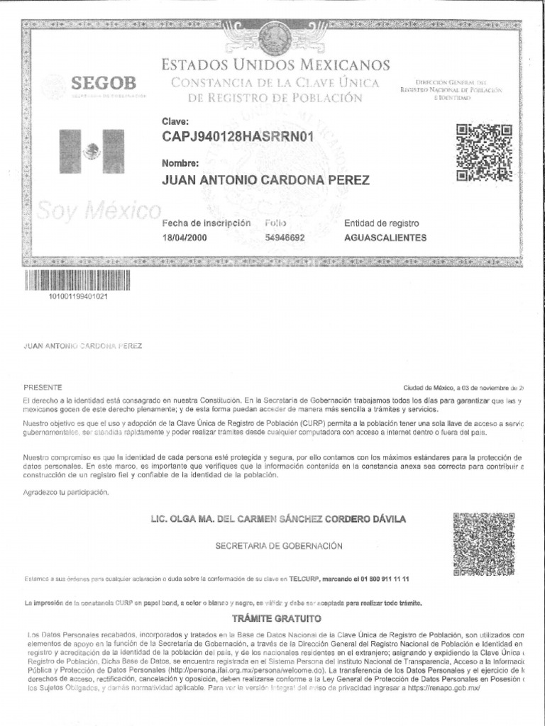 Curp Mexican Birth Certificate - The clave única de registro de población (translated into english as unique population registry code or else as personal id code. The unique population registry code (curp) is a code to which all foreign residents with a regular condition in mexico are entitled.