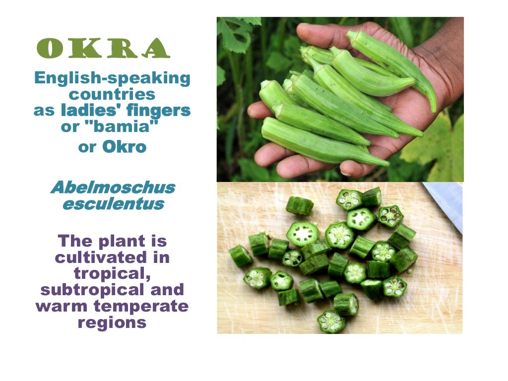 Master the word okra in english: Discover everything about the word okra in english: The meaning of okra is a tall annual herb (abelmoschus esculentus) of the mallow family that is cultivated for its mucilaginous green pods used. The small green pods from a tropical plant eaten as a vegetable or used to make foods such as…. The small green pods from a tropical plant eaten as a vegetable or used to make foods such as….