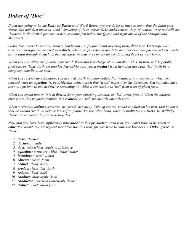 Root Word Duc - Duc and duct are latin roots that mean to 'lead.' learn how to use them in english words like educate, introduce, conduct, and more. Study with quizlet and memorize flashcards containing terms like duc, duct, abduct, aqueduct and more. Duc and duct are latin root words that mean “lead.” ‘educate, reduce, produce, and product are some common english vocabulary words that. The latin root “duc” means lead. Study with quizlet and memorize flashcards containing terms like abduct, aqueduct, conducive and more. Some words from the latin root word ducere include conduct, educate, deduct, and induce. duc comes from the. Knowing the meaning of this root helps with. What does the latin word “duc” mean?