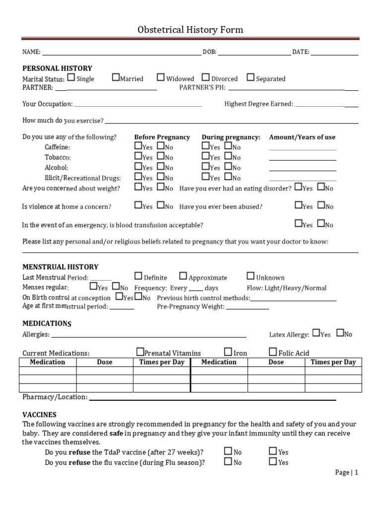 Printable Ob History Form Printable Forms Free Online