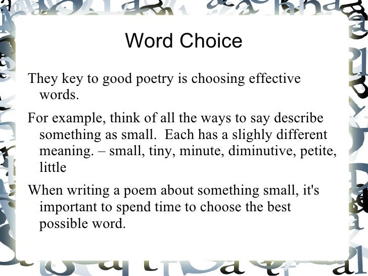 Word Choice Poem - Word choice in poetry is an important literary element for writers that can greatly affect the way a poem speaks to readers. Word choice is a critical aspect of poetry that can greatly impact the overall tone, mood, and meaning of a poem. Why is word choice important in poetry? The careful selection of words by a. Word choice in poetry is crucial because it condenses ideas and conveys precise.